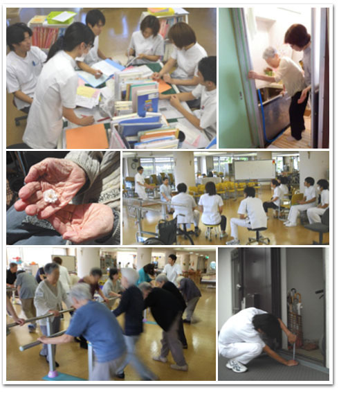 立位訓練/床上動作訓練/団使用を想定しての起き上がり/うつ伏せによる姿勢改善/屋外歩行訓練